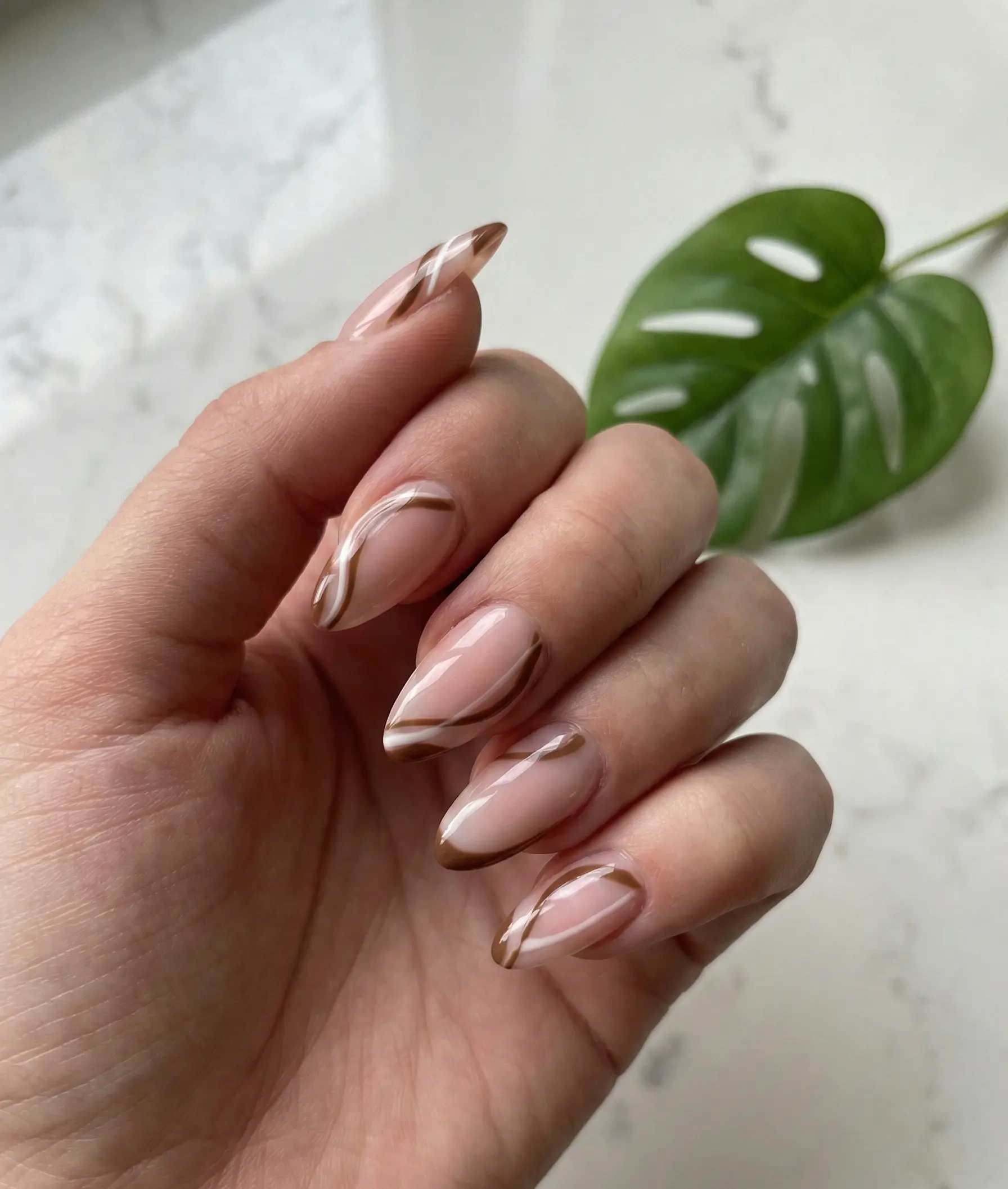 Trendy Brown And White Abstract Swirls On Almond Nails For A Minimalist Latte Look